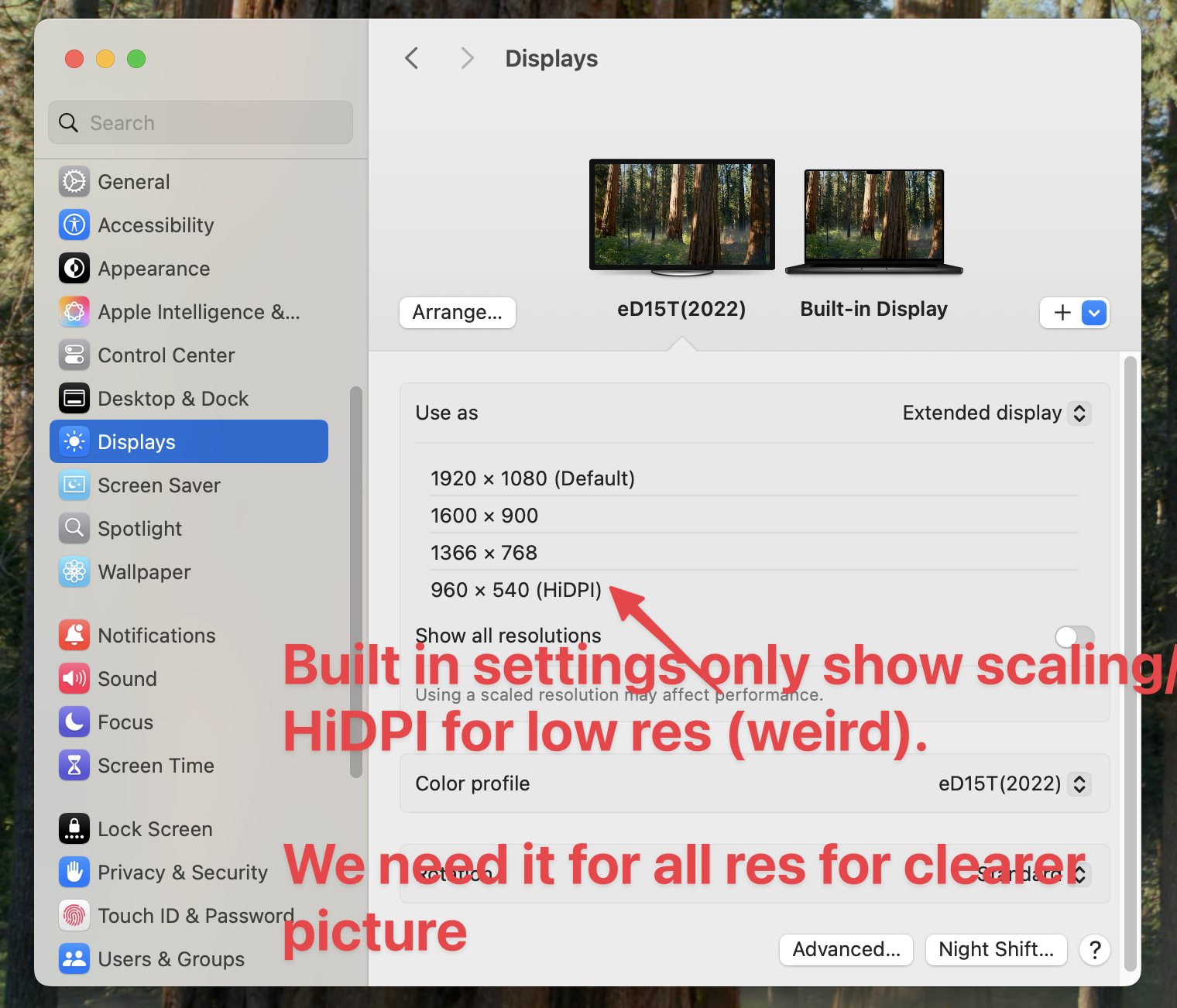 How I enabled scaling on my espresso display. MacOS settings doesn’t list the HiDPI/scaling enabled resolutions for some reason but it’s actually supported (screenshot 1). Here’s how!